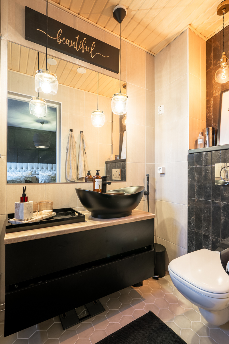 • Yläkerran wc:n yhteydessä suihku. Pesuhuoneessa sekä yläkerran wc:n pesutilassa sähköinen lattialämmitys.